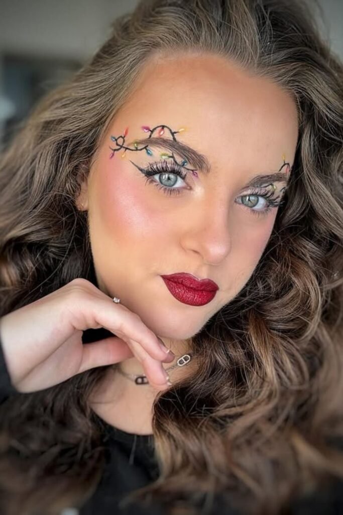 Whimsical and bright, this look turns Christmas lights into eye art a fun twist for holiday parties or themed photo sessions.