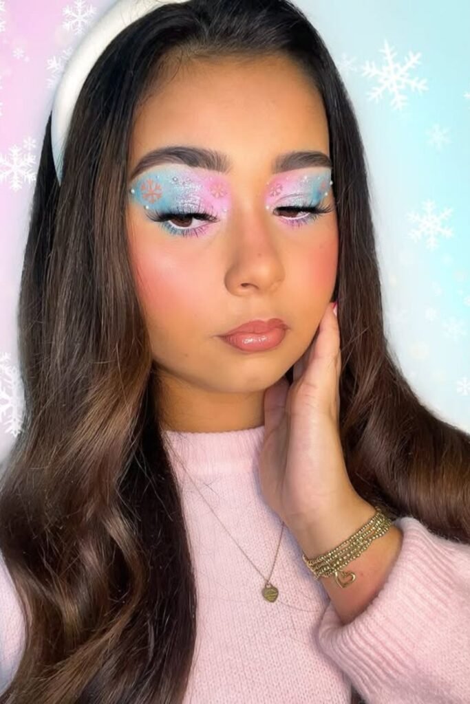 The frosted blue and silver eyeshadow with rhinestone snowflake accents is great for holiday gatherings or fun winter photo shoots.
