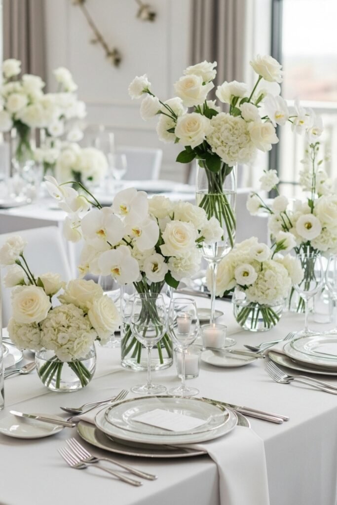 Begin with varied white shades across florals, linens, and décor so the space feels rich, warm, and intentionally styled.