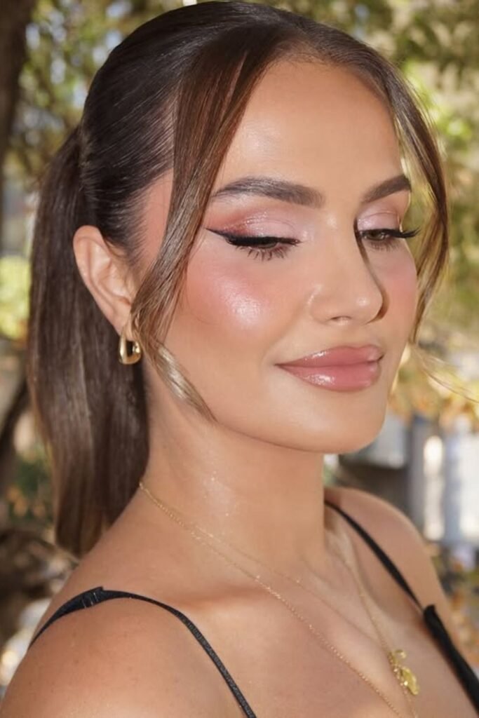 Soft shimmer meets structure in this romantic clean look. The rosy blush and glossy lips make everything seem good combined, and the winged eyeliner gives the look a little lift without making it look too fake.