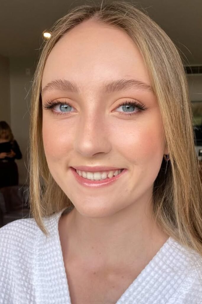 The foundation is light enough that freckles and warmth can show through, and a delicate rose blush brings the whole face together.