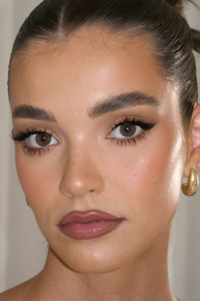 The base is smooth and glowing, and the brows are sculpted and the lip is a neutral mauve that provides depth without being too much.