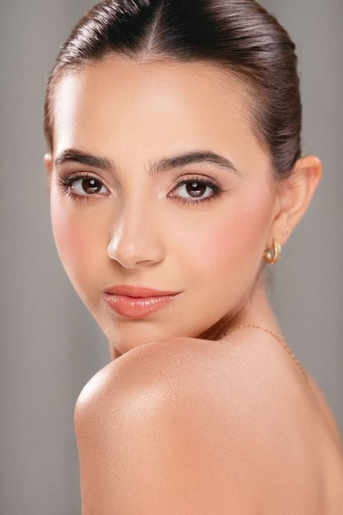 The peach blush and neutral eyeshadow bring out the natural warmth without drawing attention away from the skin.