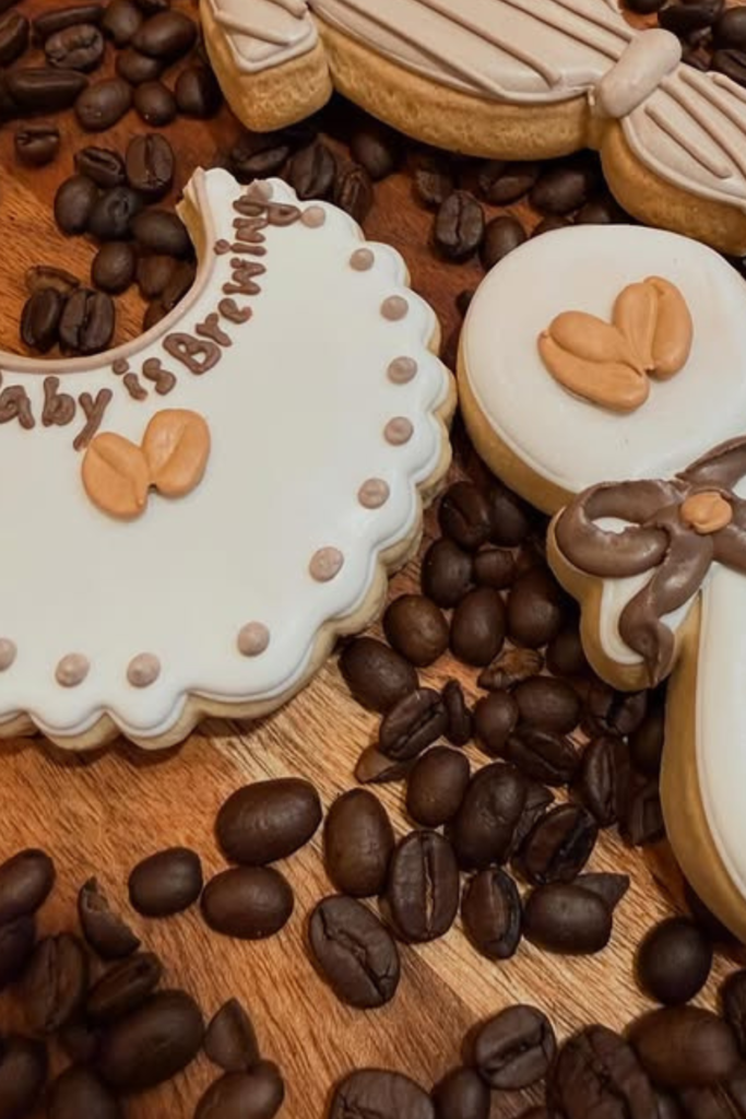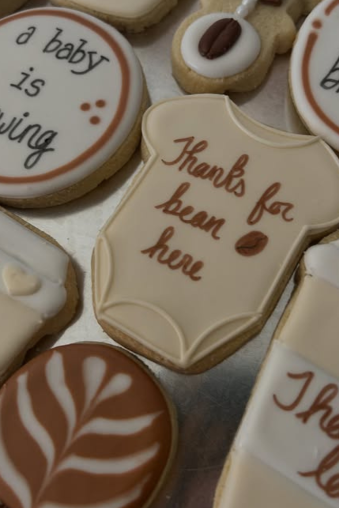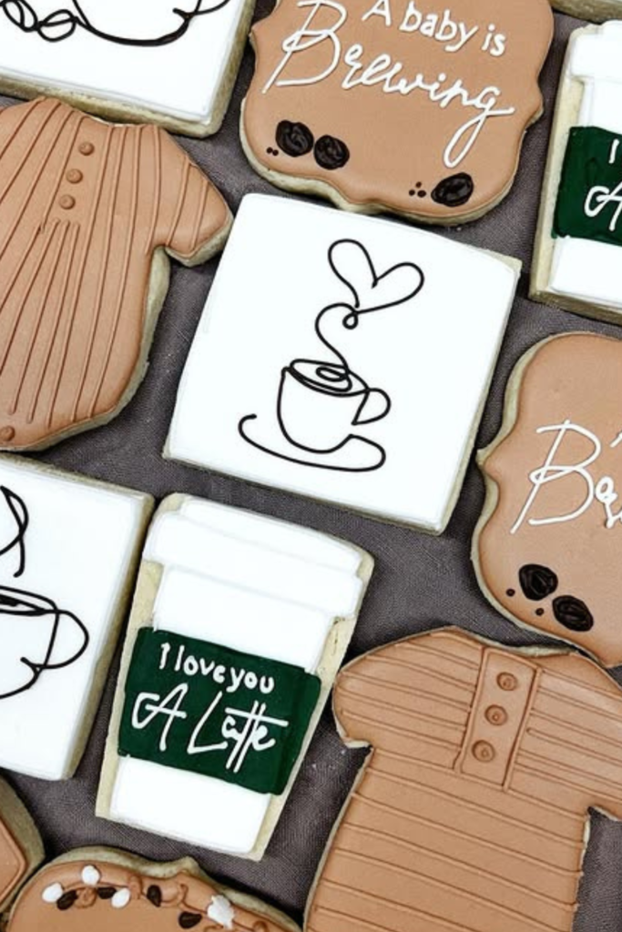 Cookies shaped like mugs, onesies, and latte art feel thoughtful without being over-the-top.
