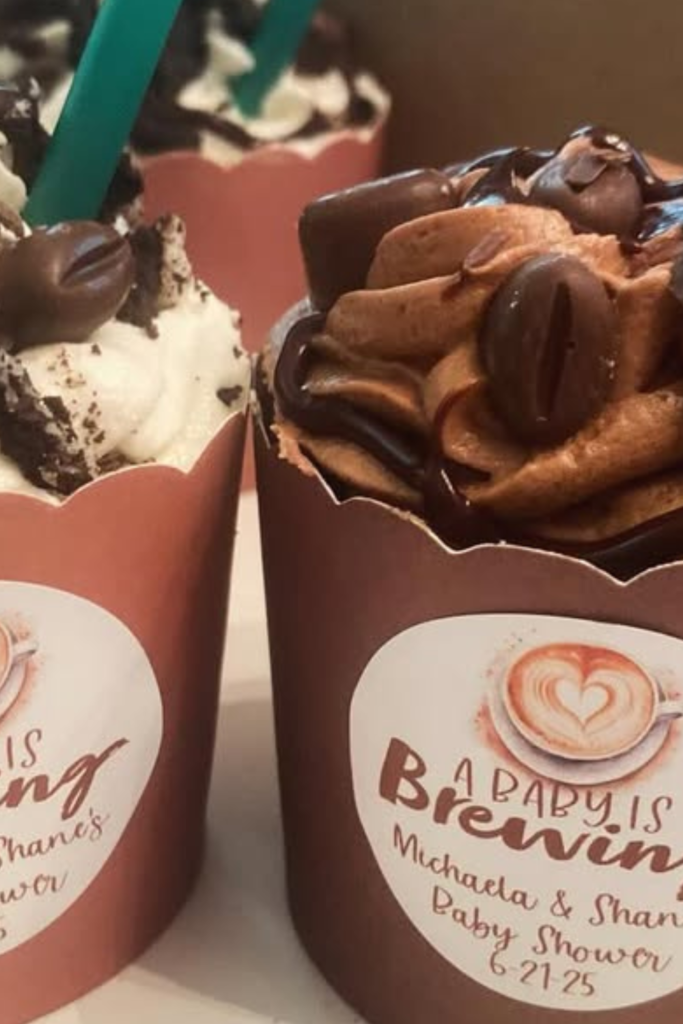 These mocha-style cupcakes instantly reinforce the theme without needing extra decor.
