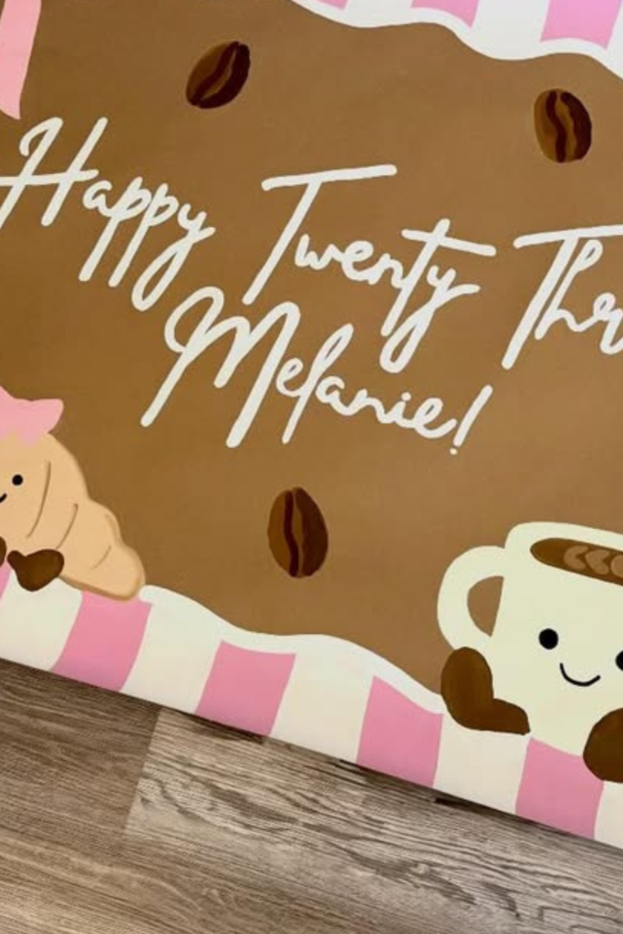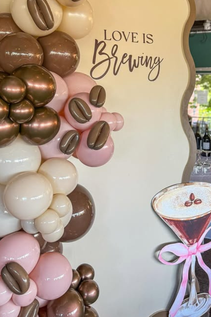 This setup works because everything talks to each other -balloons, framed signs, coffee graphics, florals, even the lighting. Nothing feels random.