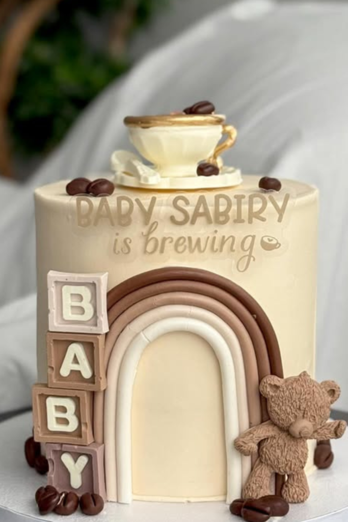 This design works because it blends baby elements (blocks, teddy bear) with subtle coffee touches like the tiny cup and scattered beans.
