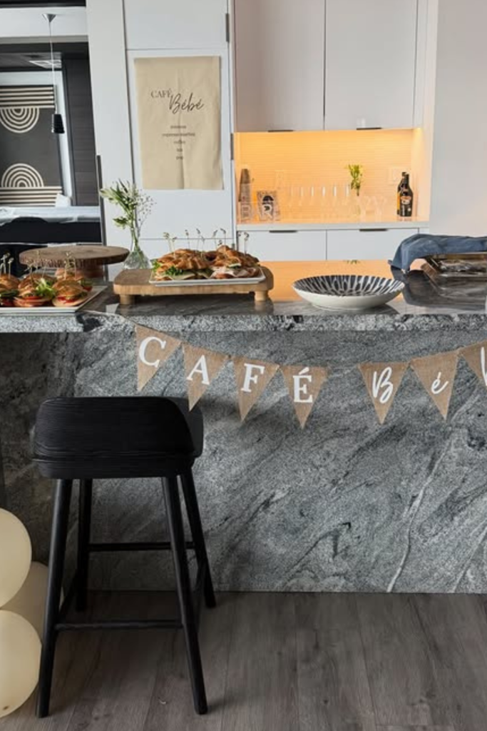A simple “Café Baby” banner, neutral tableware, and clean styling keep it modern instead of cluttered.