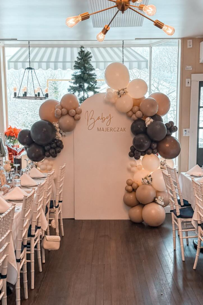 The neutral brown tones blend beautifully with a mocha balloon backdrop, keeping everything cohesive.