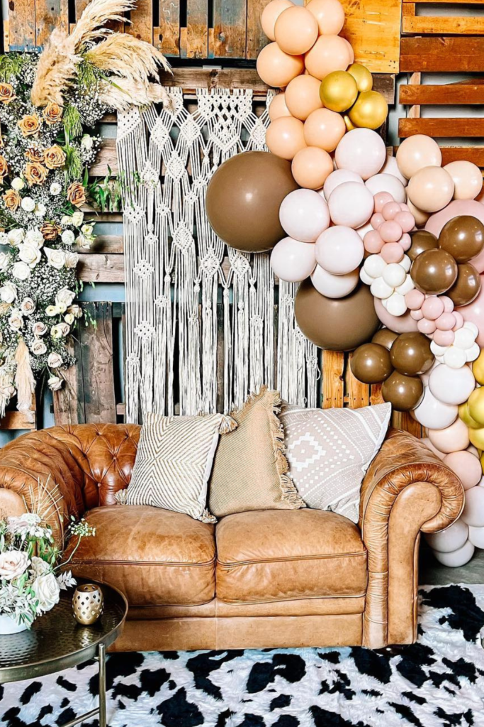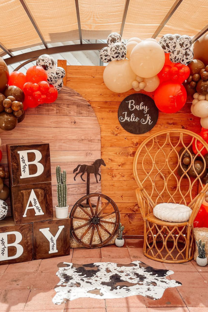 Start with a wooden wall or panel to create that rustic ranch vibe, then build around it with balloon garlands in earthy tones like brown, cream, and rust.
