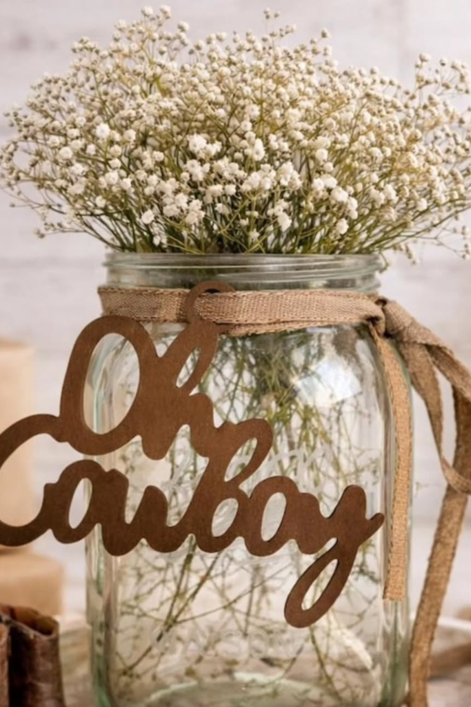A mason jar centerpiece with baby’s breath flowers creates that soft farmhouse look that fits perfectly with a cowboy theme.