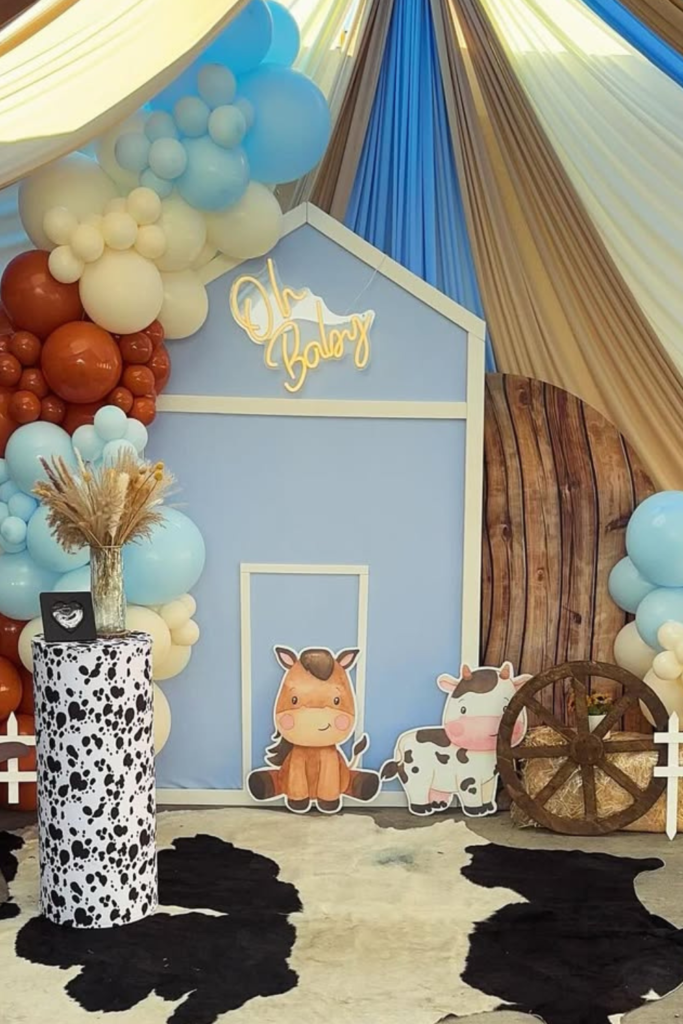 Pair it with a wooden backdrop, wagon wheel accents, and a balloon garland in soft blues and creams to keep the space baby-shower friendly.