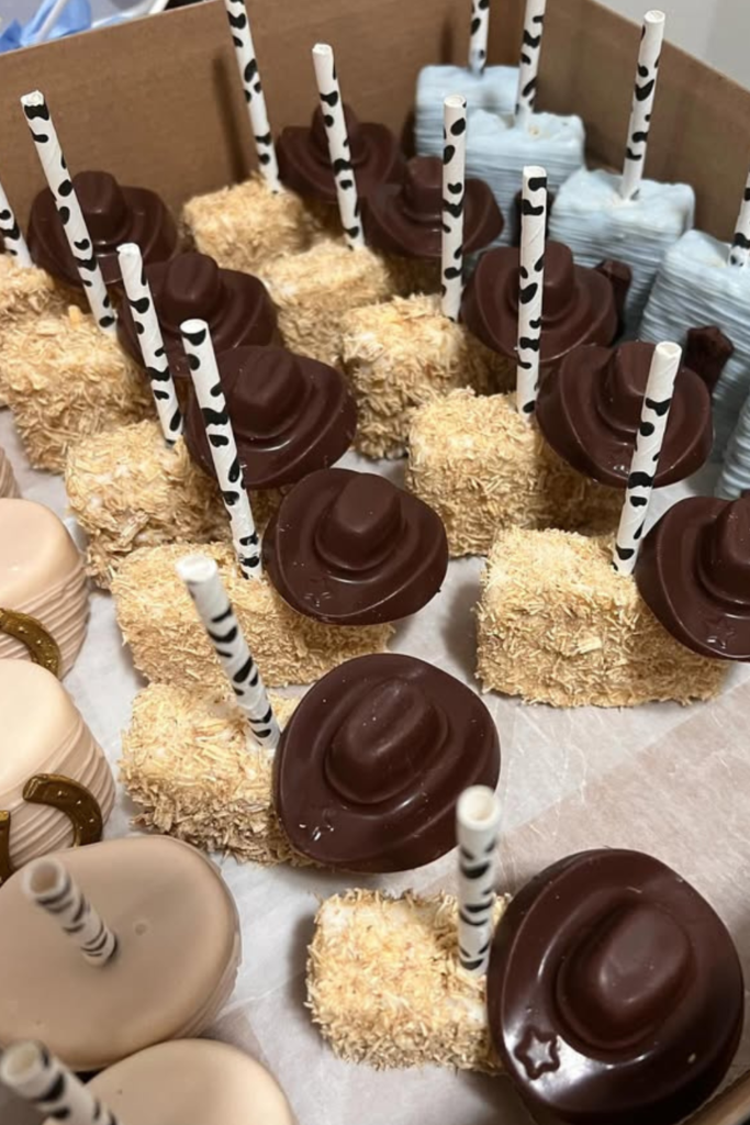 Chocolate cowboy hats, coconut “hay bale” squares, and cow-print cake pops instantly make the display feel fun and themed.