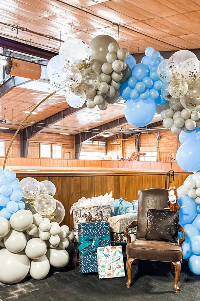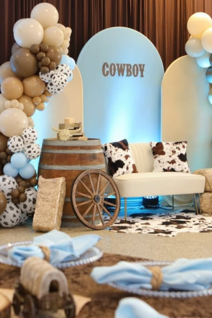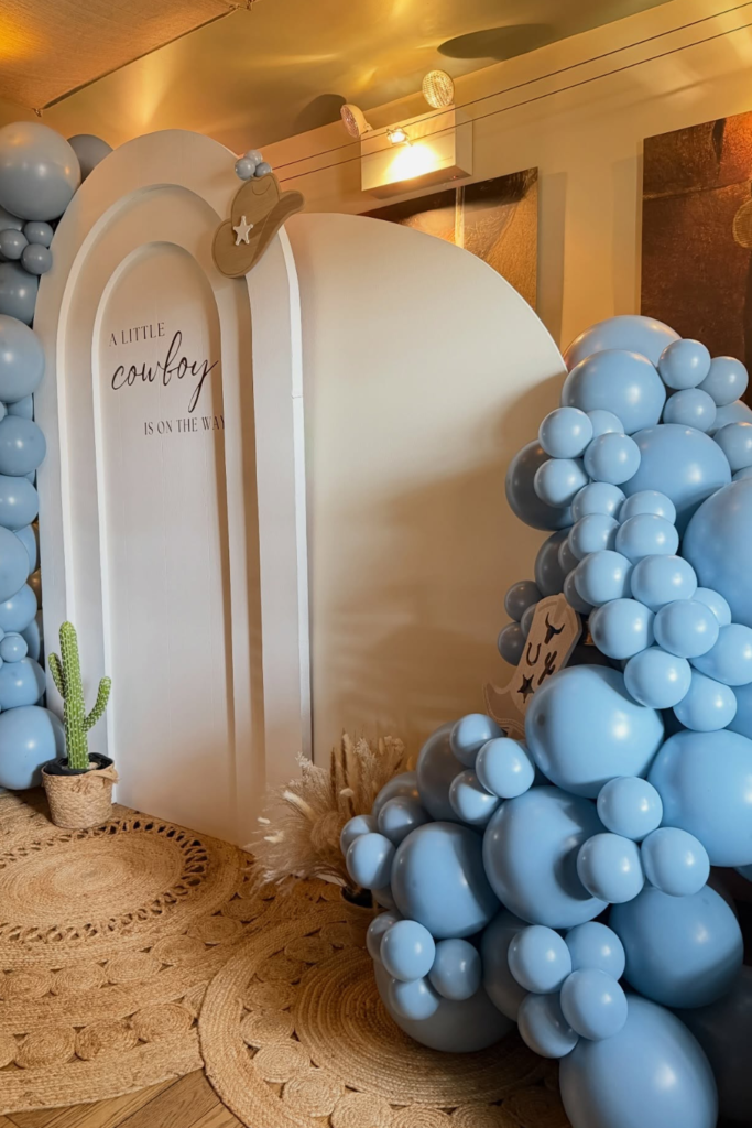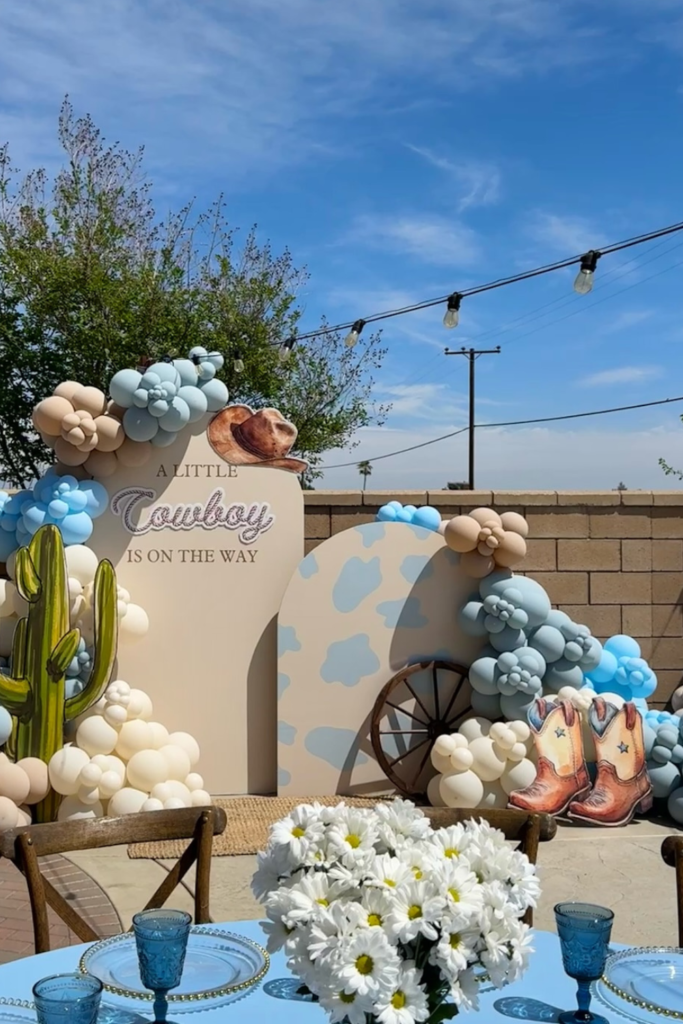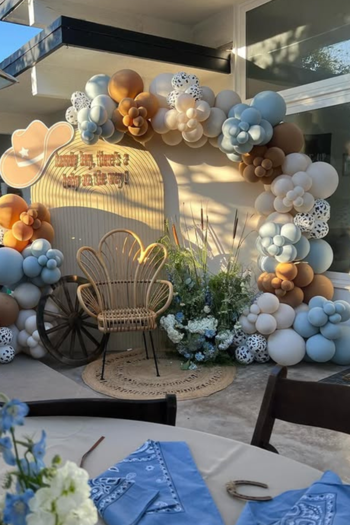 For a softer take on the cowboy theme, lean into dusty blue balloon arches instead of the usual browns and reds.