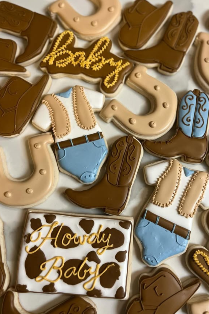 Shapes like boots, horseshoes, hats, and tiny baby outfits instantly bring the theme to life on the dessert table.