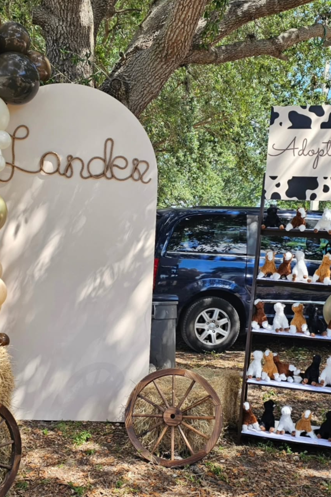 Pairing it with hay bales, wagon wheels, and balloon clusters keeps the look playful and textured.