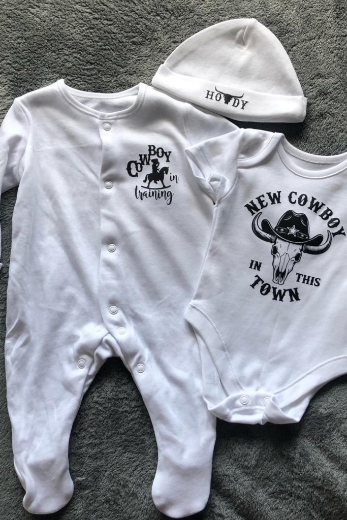 The simple white pieces keep it soft and baby-friendly, while the western graphics and the “Howdy” hat add personality.