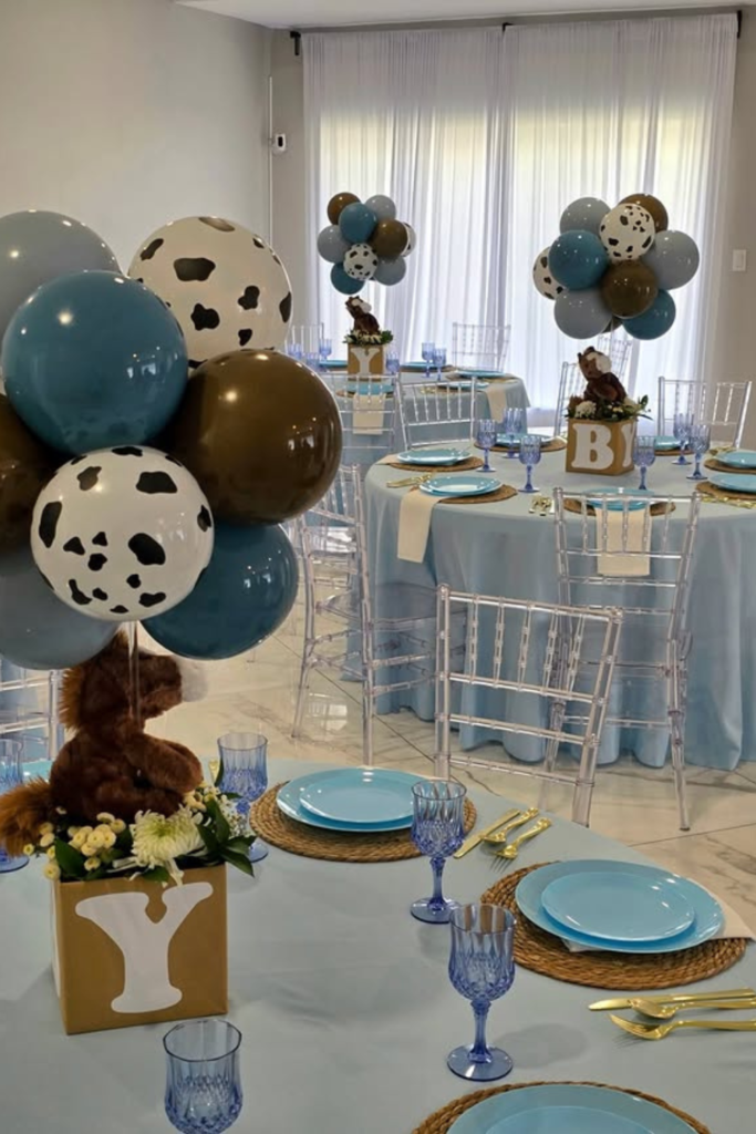 A mix of dusty blue, chocolate brown, and cow-print balloons instantly reinforces the cowboy theme while still feeling soft enough for a baby shower.