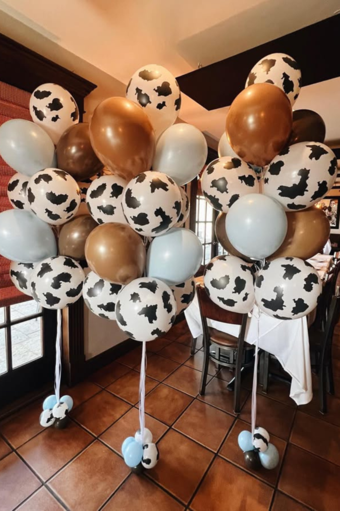 Few things say “western party” faster than cow-print balloons, and using them in large bunches makes a big visual impact.