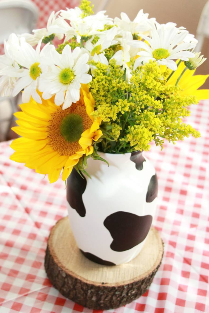 A cow-print milk jug filled with daisies and sunflowers instantly gives that countryside charm without needing complicated decorations.