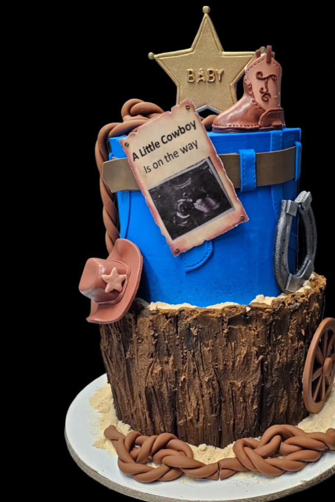 Including a sign like “A Little Cowboy Is on the Way” makes the cake feel personal to the occasion.