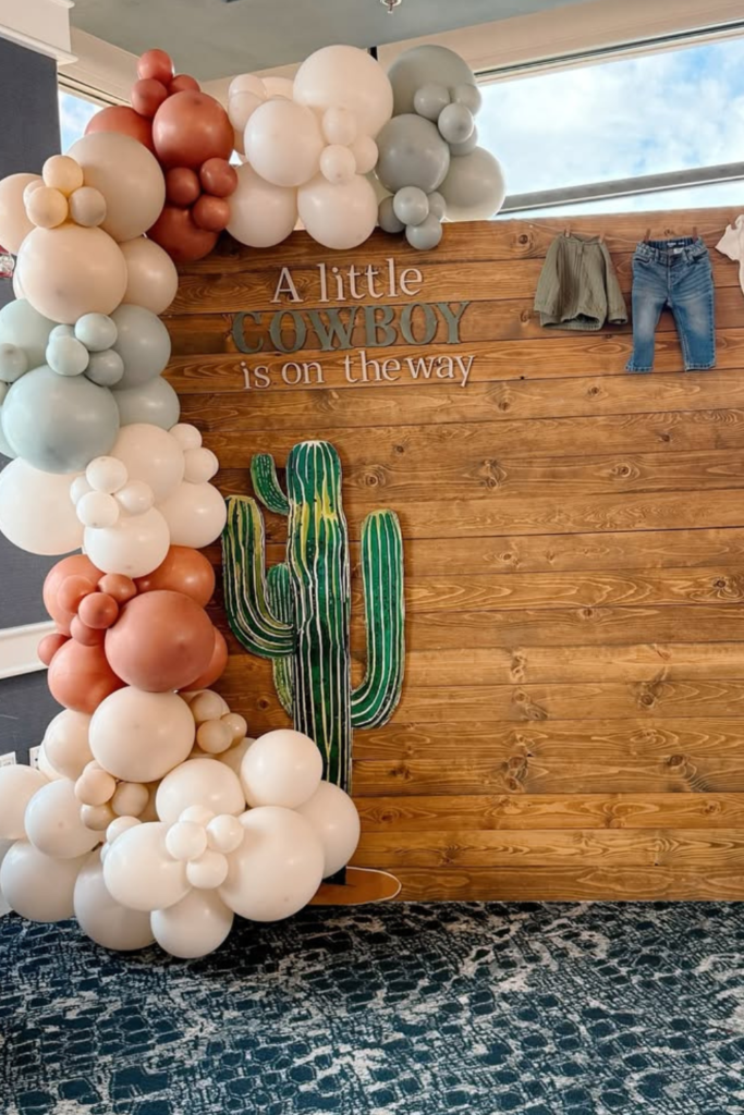 The phrase “A Little Cowboy Is on the Way” instantly sets the tone, while balloon garlands in earthy shades soften the rustic wood.
