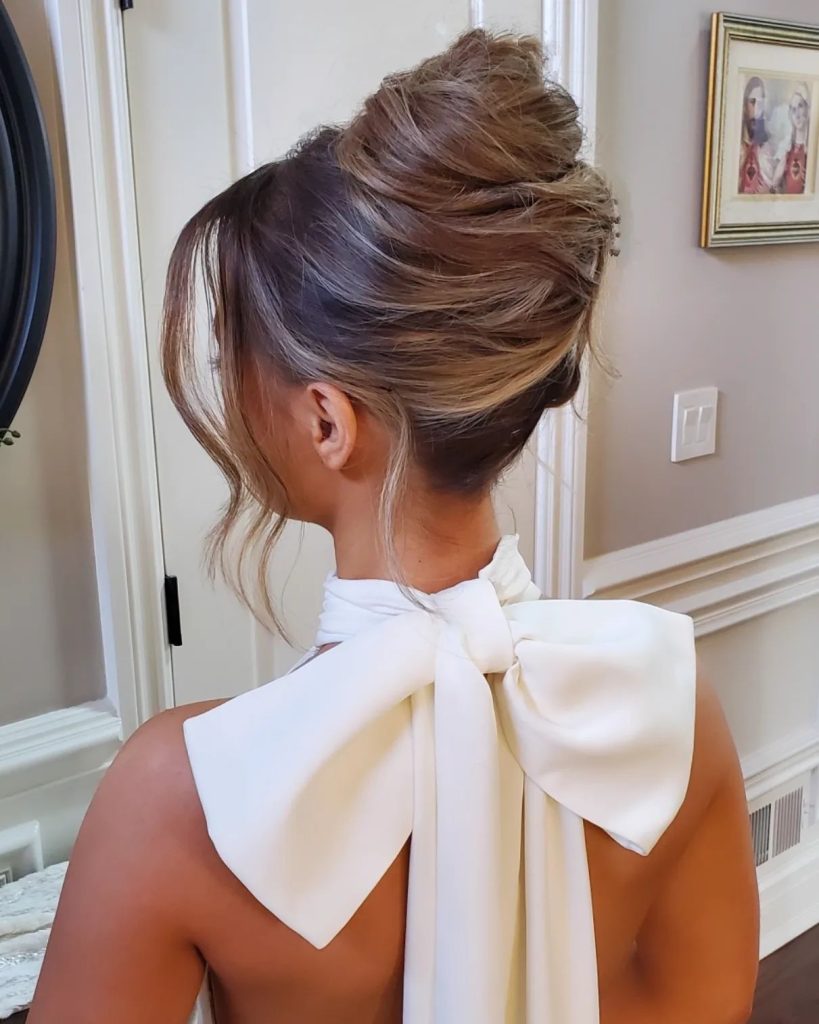 To achieve this look, start by gathering your hair into a high ponytail. Gently twist the ponytail into a loose bun, allowing some strands to fall naturally around it.