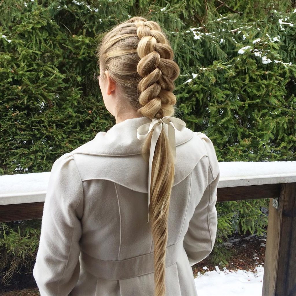 This hairstyle offers the sleek look of a high ponytail while adding the stability of a braid.