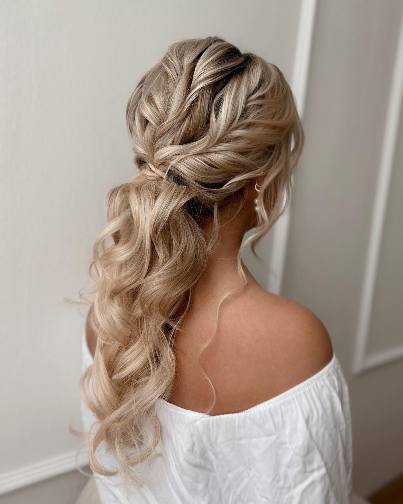 Begin by loosely curling your hair using a large-barrel curling iron to add texture and body. Once curled, gather your hair into a low ponytail, ensuring it rests comfortably at the nape of your neck.