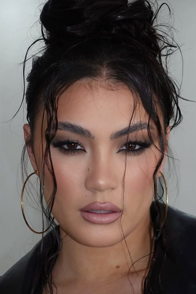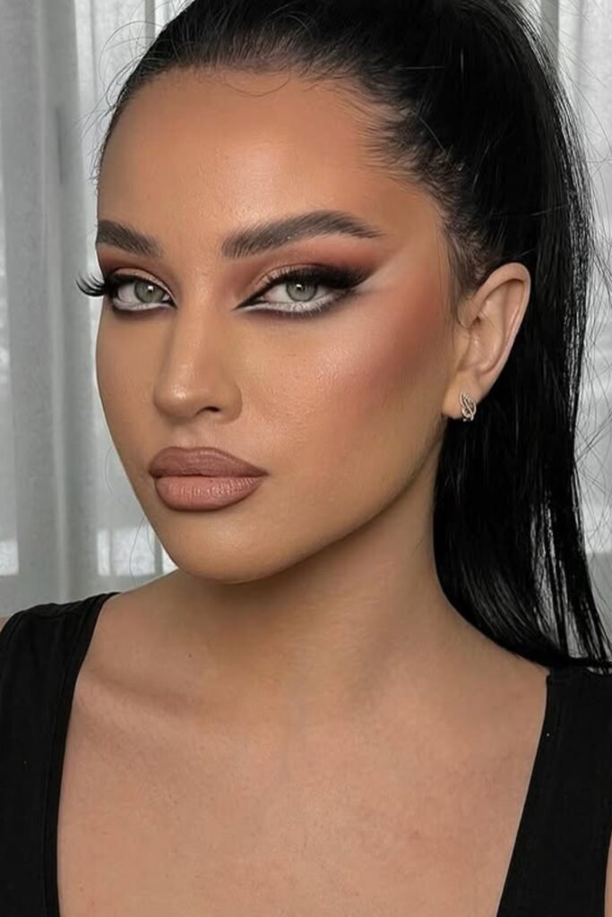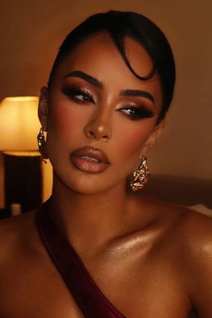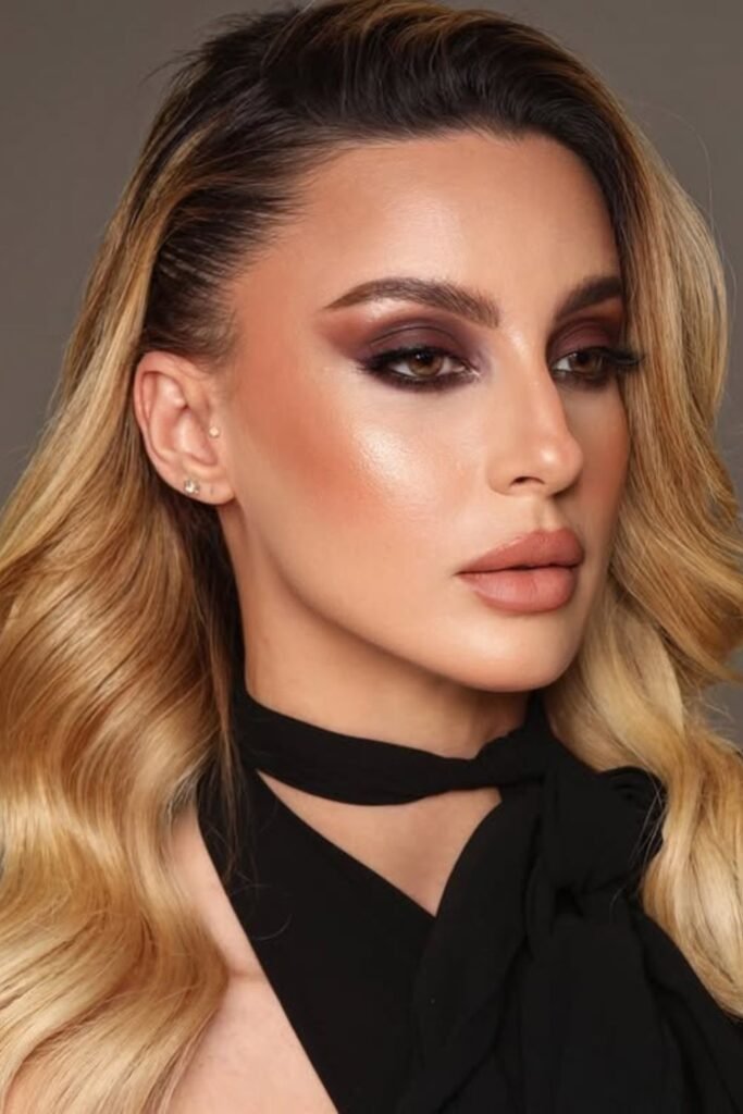 This look pairs a strong smoky eye with a soft nude-mauve lip for a bold and alluring style.