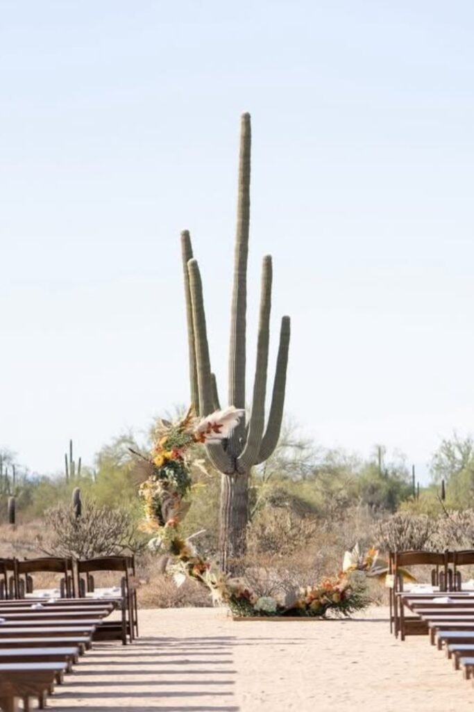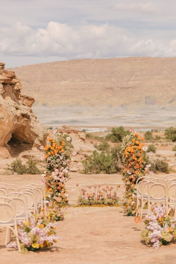 Your aisle sets the tone before anything else, so framing it with florals helps guide attention forward instead of letting the desert feel overwhelming.