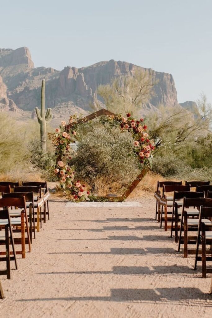 Hexagon arches introduce geometry into desert ceremonies, adding structure that feels modern without overpowering.