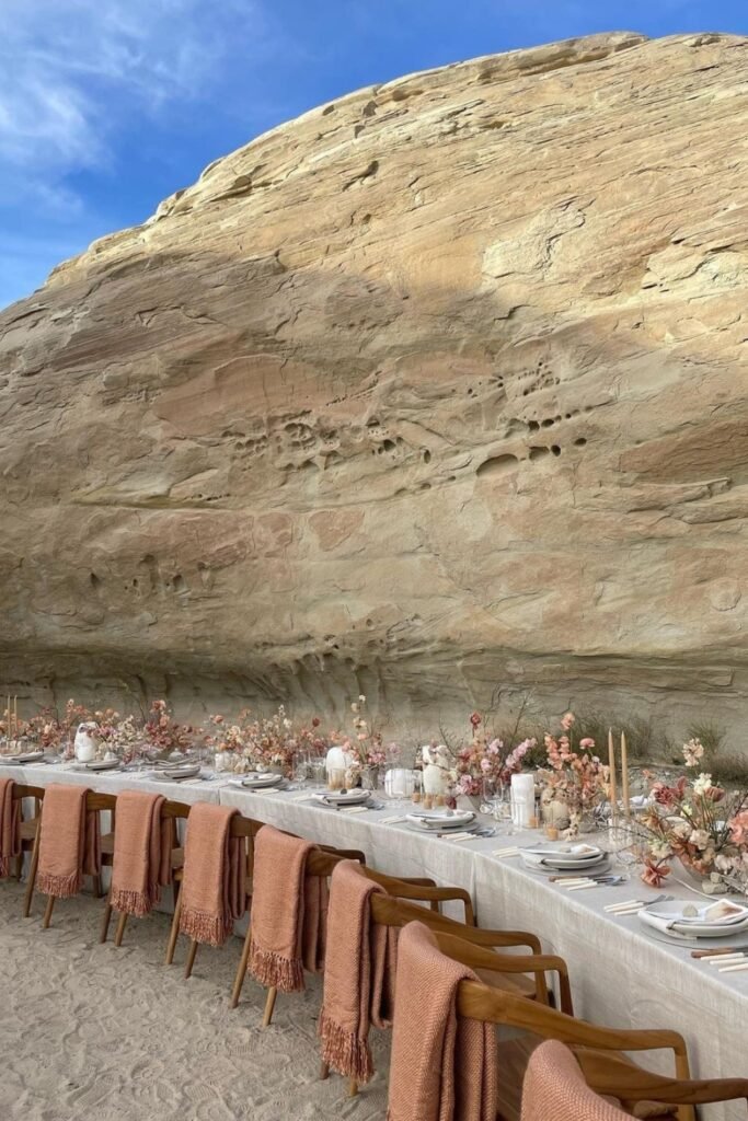 When the desert already feels dramatic, anchoring your reception against natural rock formations instantly creates intimacy without needing heavy structures.