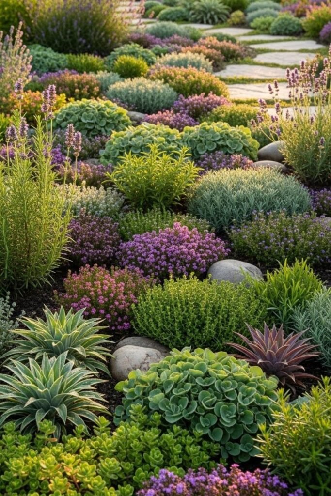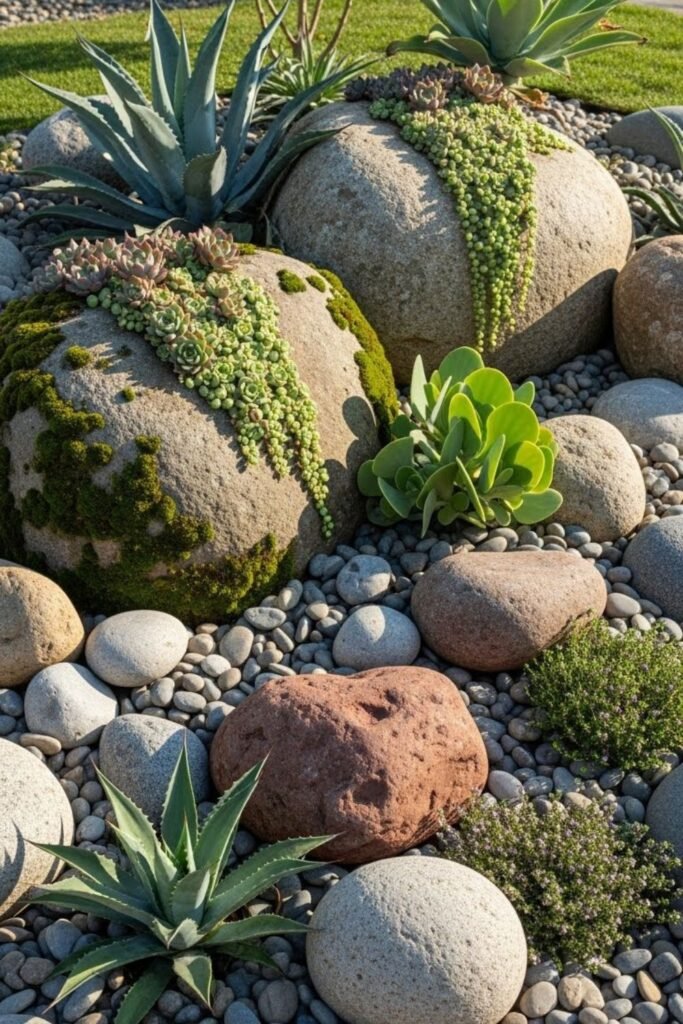 Too much rock feels harsh, so I balance stone with living plants. I place boulders for structure, then soften edges with drought-tough greenery.