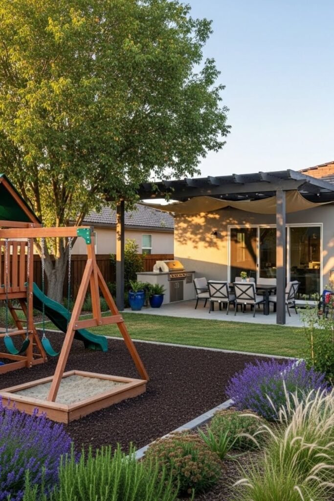 Play spaces stay safe and soft, while the rest of the yard saves water and maintenance without sacrificing family comfort or outdoor fun.
