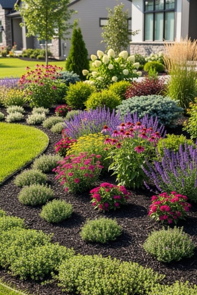 Beds hold moisture better, shade soil, and let roots grow deep. Mulch finishes the job. The result feels intentional, colorful, and calm.