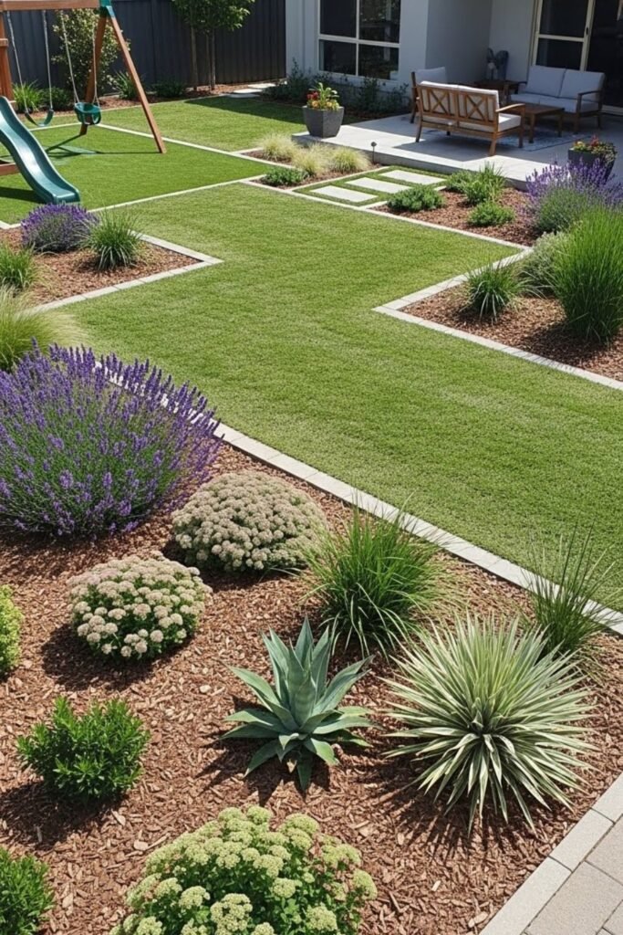 Kids need room to move, which made me rethink water use around play areas. I keep grass only where running happens and surround it with drought-tolerant plants.