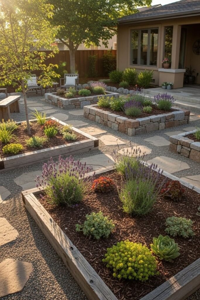 Raised areas also protect plants from foot traffic while giving structure that reads clean and calm during long, hot, unpredictable summers with minimal ongoing effort.