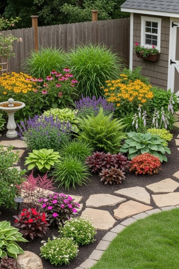 The key is balance using plants, mulch, and hard elements together instead of relying on grass alone.