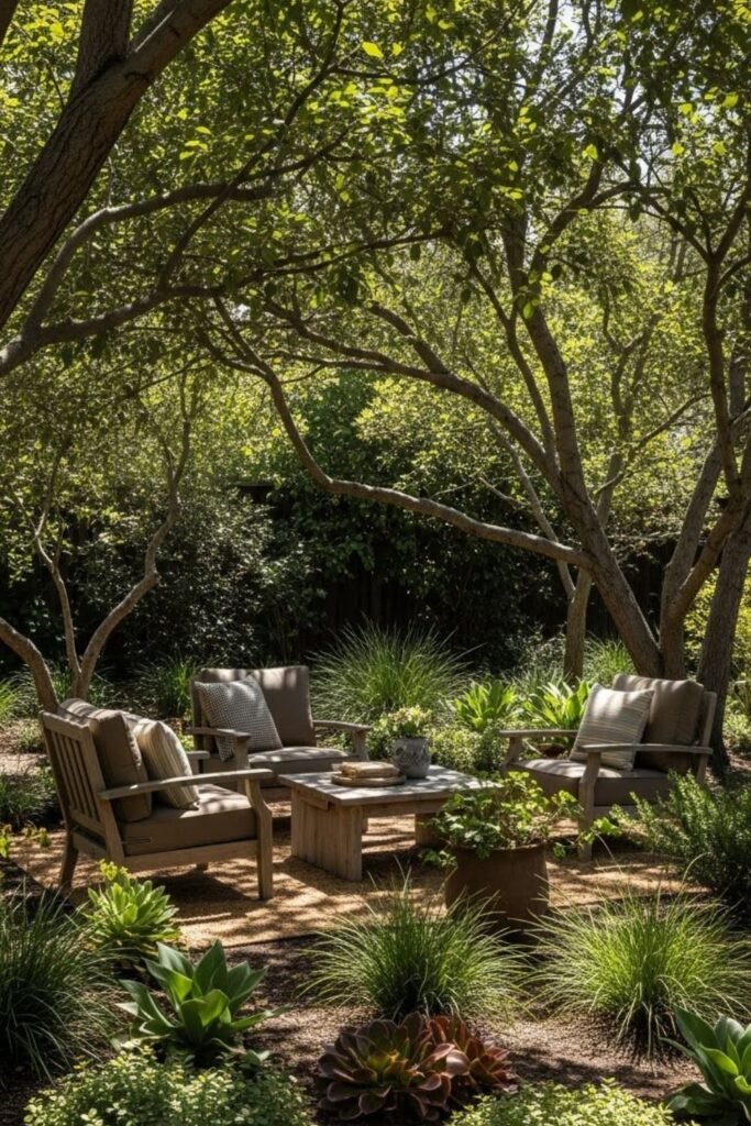 Comfort matters outdoors, so I build seating first and plant around it second. Shade trees, tall shrubs, and low-water plants surround resting areas.