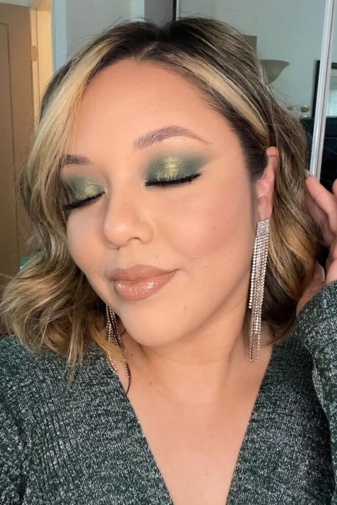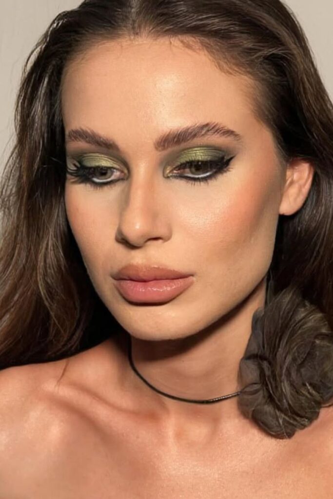 The rich green shadow blends effortlessly into darker tones for depth, while a radiant glow on the cheekbones keeps it balanced.