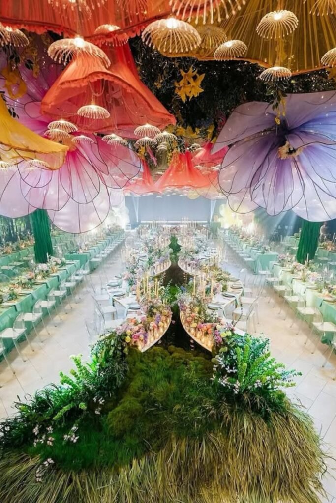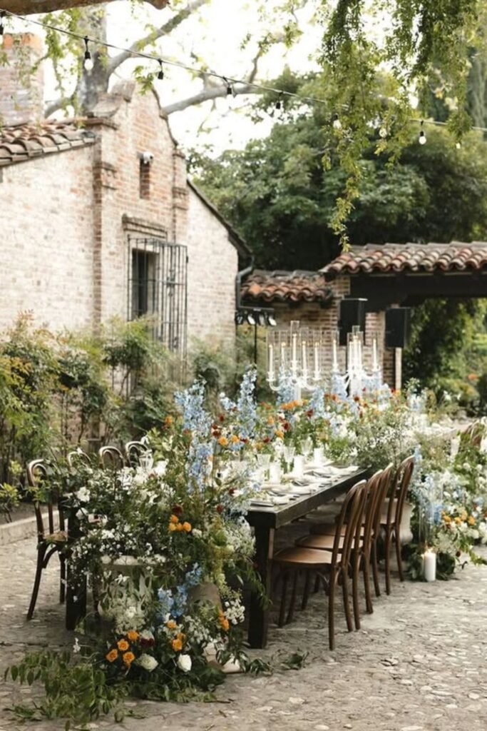 Long tables work best for this idea because they let greenery flow like a garden path. Use preserved moss, low ferns, and small flowering plants layered directly down the center.