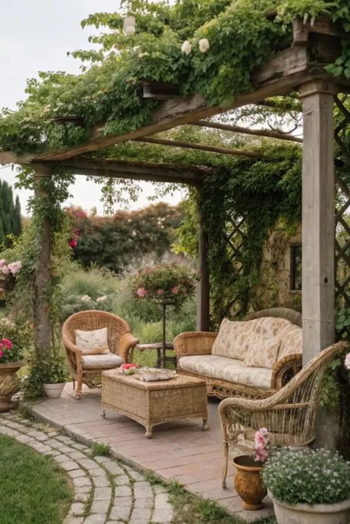 Let greenery cover the top first, then add seating underneath once the space feels enclosed. Potted flowers around the edges.