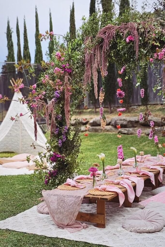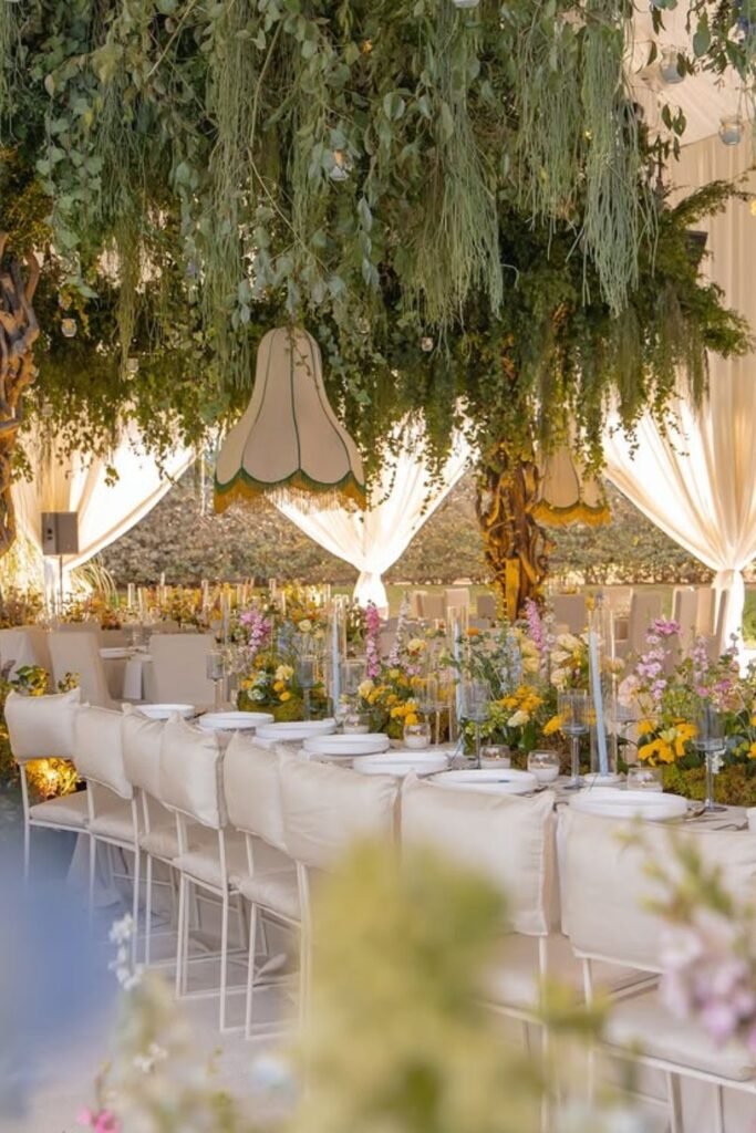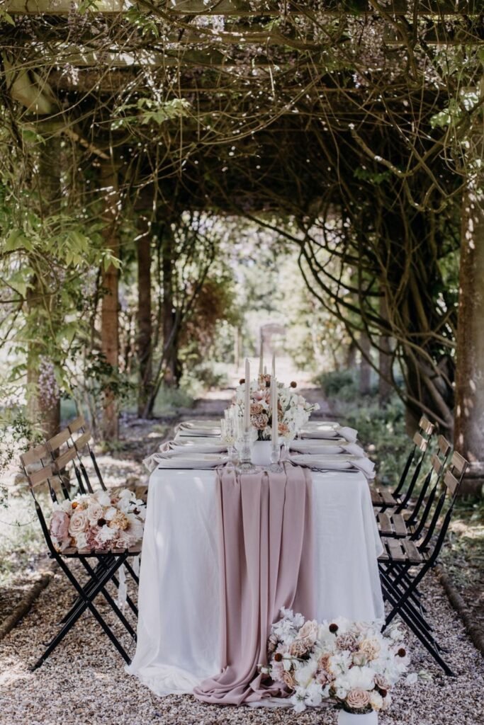 Let climbing plants weave naturally overhead, then keep table décor light so greenery stays dominant.