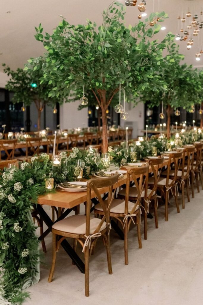 Greenery feels more immersive when it rises above the table instead of sitting on it. Potted trees work best for long dining setups where centerpieces would block conversation.