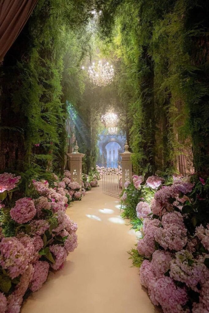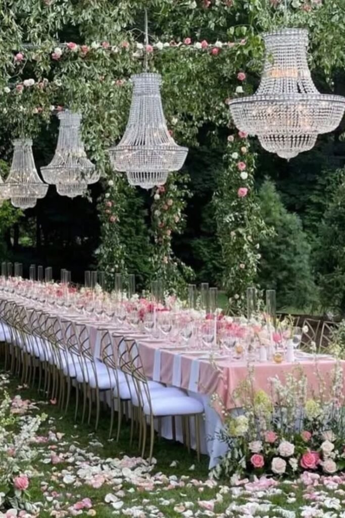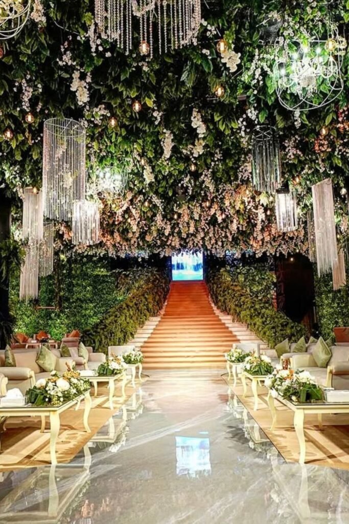 Train greenery upward first, then hang chandeliers slightly lower than the foliage. The mix of leaves and light.
