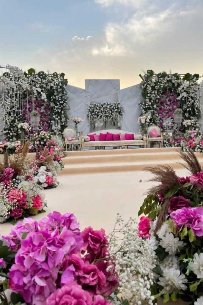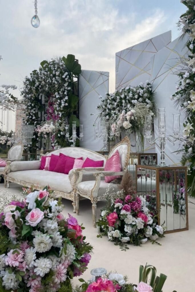 Where flowers can frame the space from all sides. Place sofas first, then build low arrangements and vertical greenery around them.