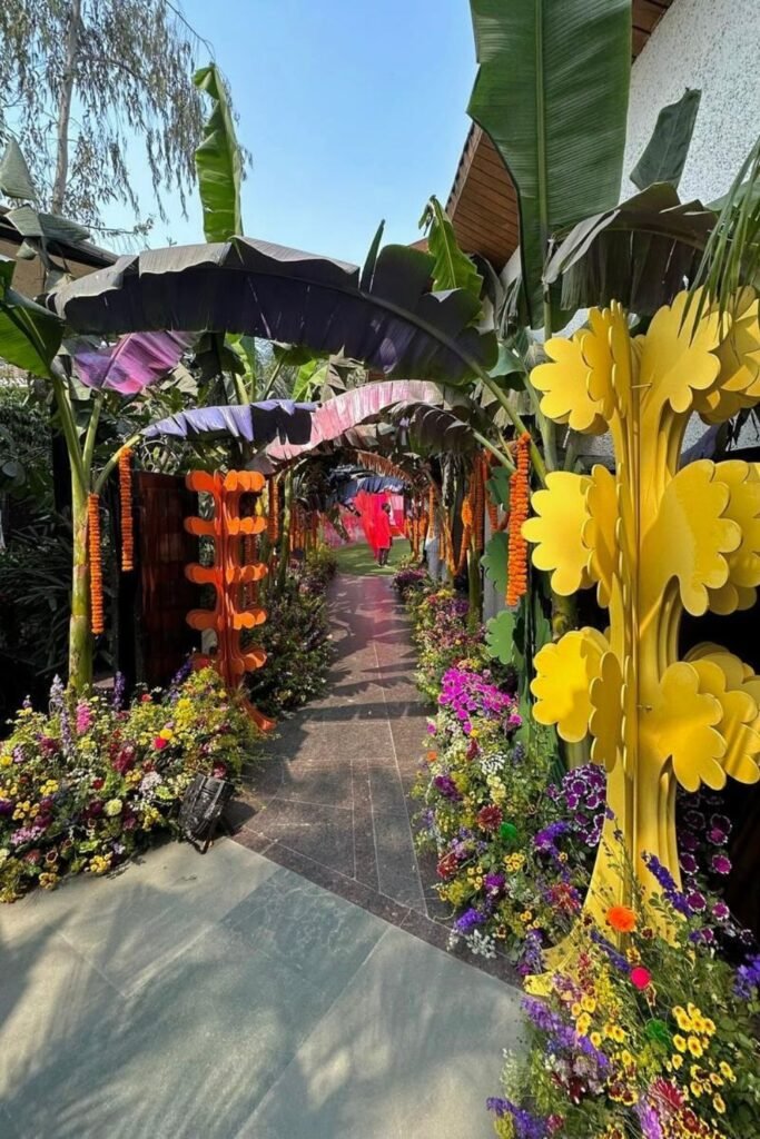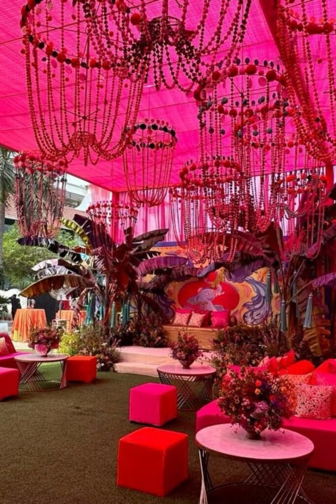 Bold color works when plants anchor the space first. Bright fabric overhead feels less overwhelming once greenery fills the ground level.