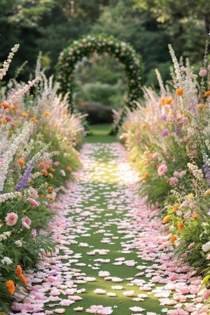 Loose petals change an ordinary grass walkway into something slow and intentional. This idea works best between two planted borders.