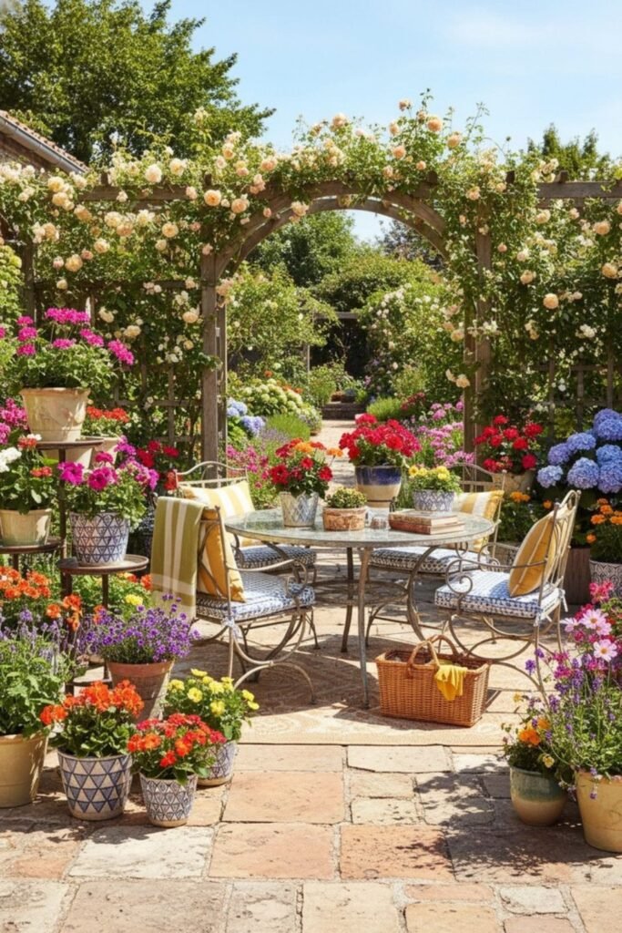 Abundance feels intentional when plants surround seating instead of crowding it. Clustered pots work best on patios or paved gardens where soil planting isn’t possible.